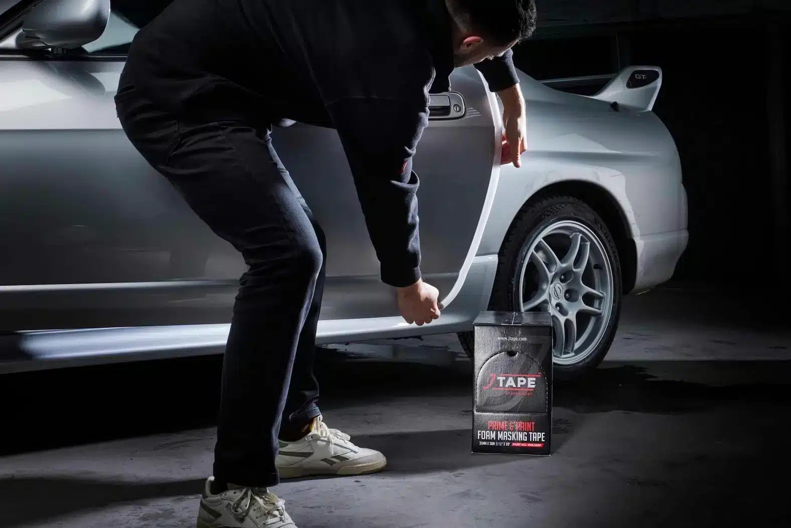 • A box of white masking tape sits open on a workshop stool, with a blurred gray car and mechanical tools in the background.