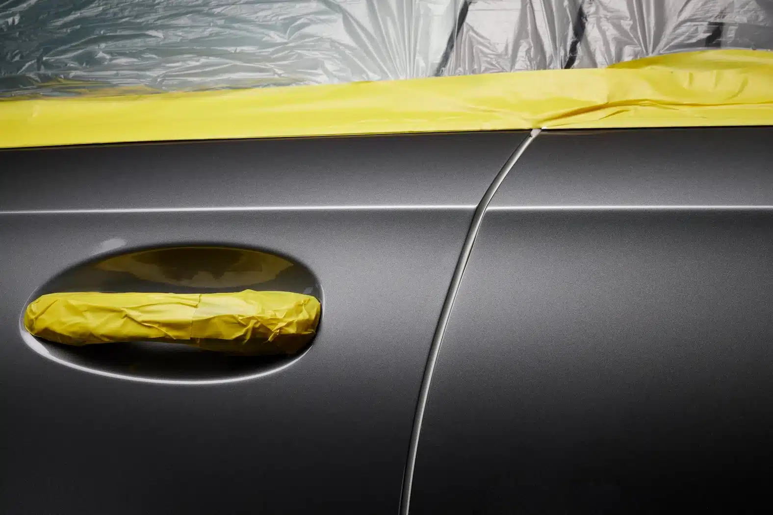• A roll of bright yellow wide tape, standing upright on a dark surface, with a blurred background that includes another roll of tape and a car door.
