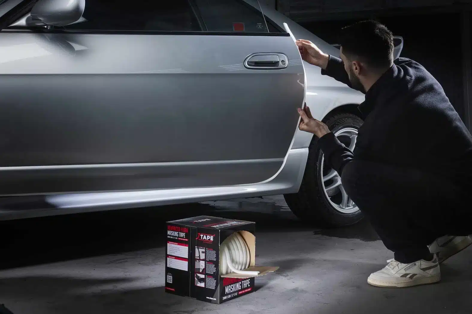 • A box of white masking tape sits open on a workshop stool, with a blurred grey car and mechanical tools in the background.